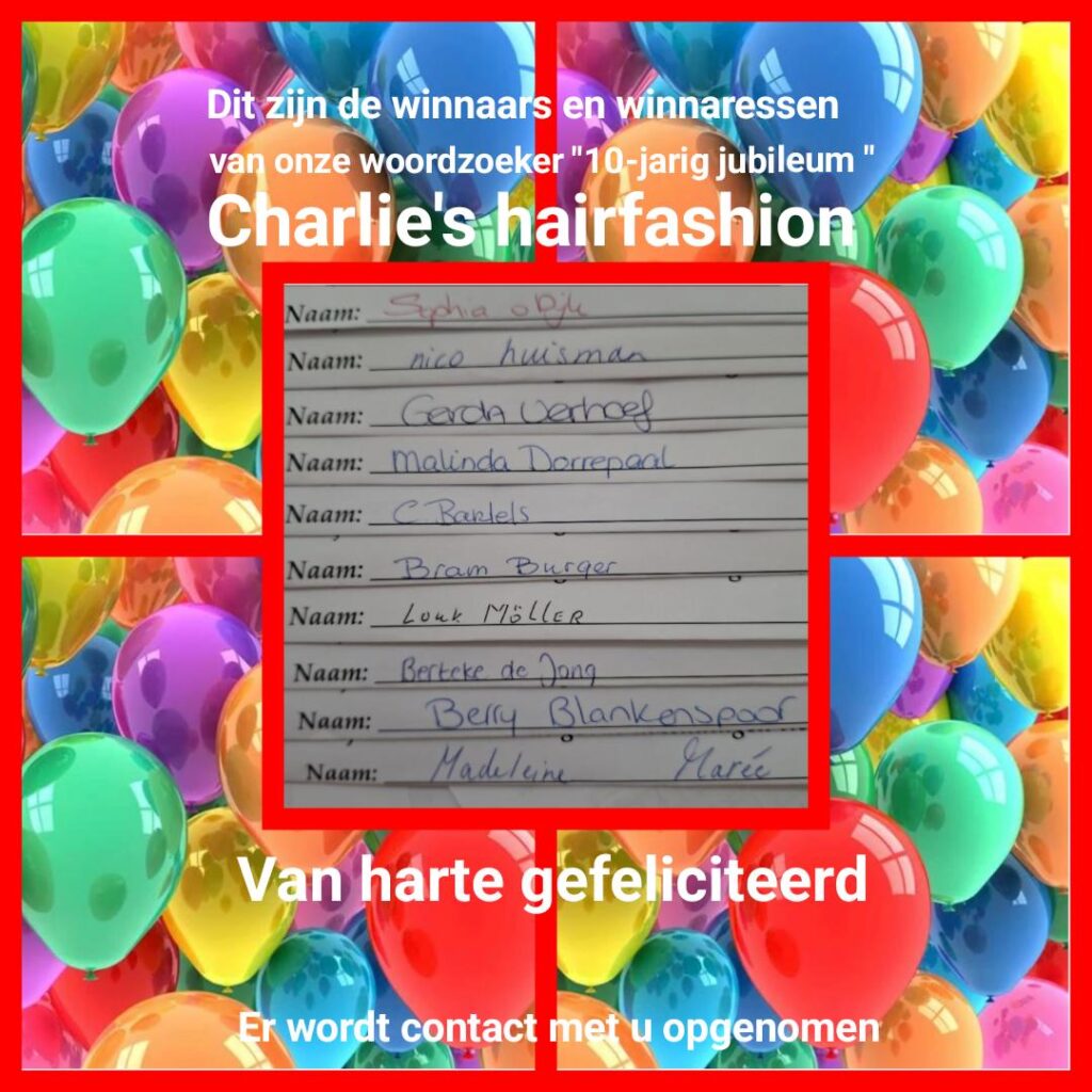 Charlie’s hairfashion 1 oktober aanstaande, 10 jaar bestaat? Wij ons10-jarig jubileum met u gaan vieren vanaf dinsdag 30 september? Wij ons 10-jarig jubileum met ons personeel gaan vieren op zaterdag 4 oktober (inclusief overnachting)? De Salon dus op zaterdag 4 oktober gesloten is? Er binnenkort weer een leuke woordzoeker (inclusief klanttevrenheidsonderzoek) voor u […]
